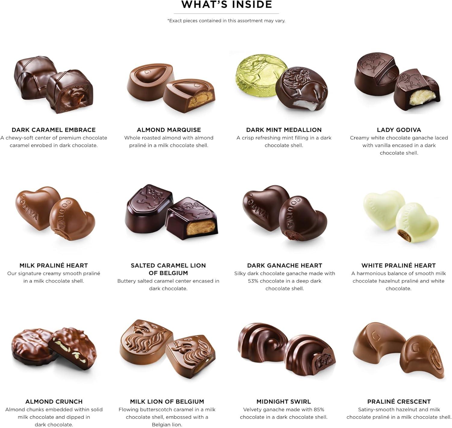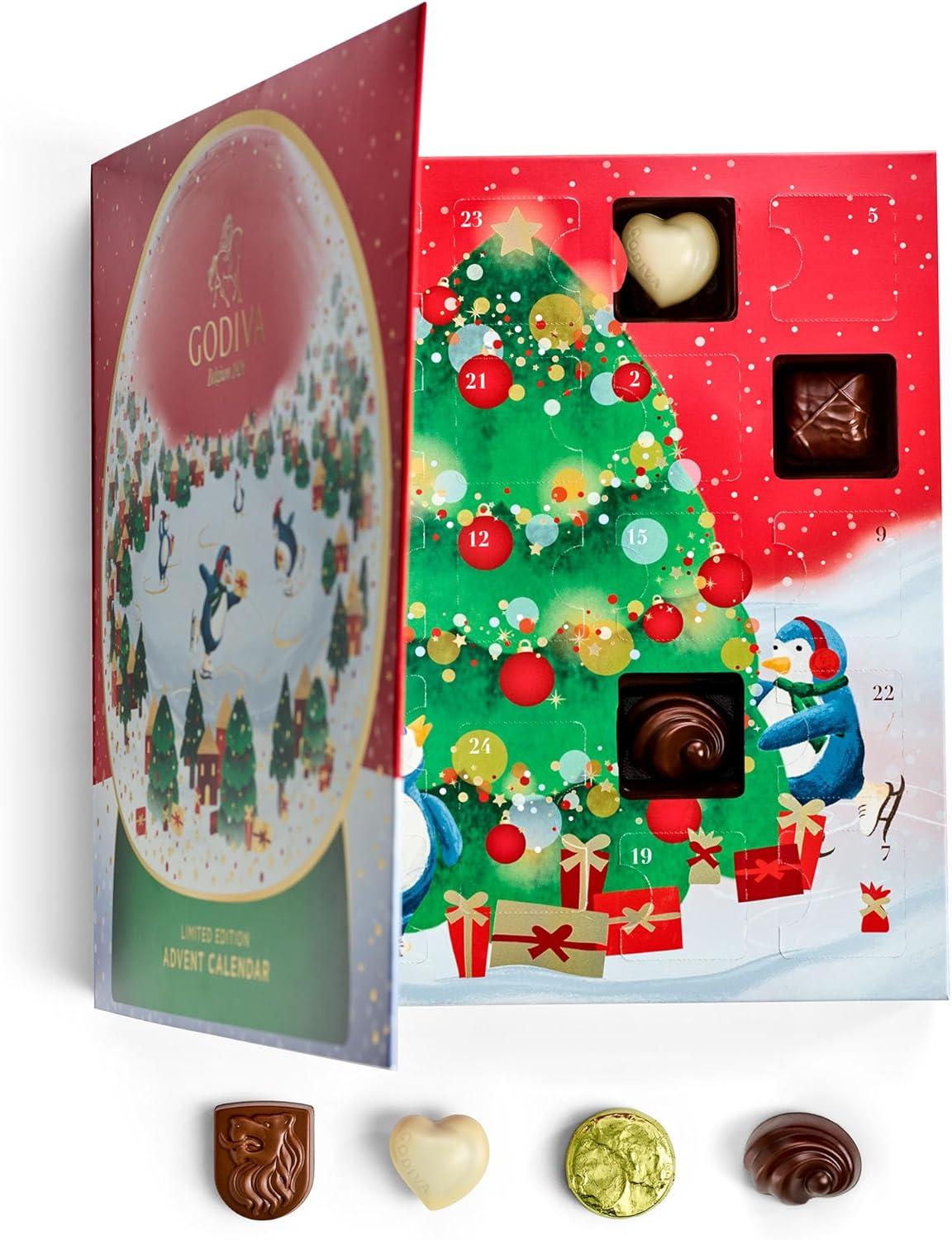 Make every day of December feel magical with the 2025 Godiva Chocolatier Advent Calendar, a festive countdown filled with gourmet chocolates. Behind each window awaits a decadent surprise, from silky milk chocolate to rich dark chocolate and smooth white chocolate, crafted with the premium ingredients and artisan expertise that make Godiva world-renowned. This holiday-exclusive chocolate gift set is designed to delight both children and adults, creating moments of joy throughout the Christmas season. Inside, you’ll discover a carefully curated selection of Godiva’s signature chocolates from creamy milk chocolate Praline Hearts and the iconic Lion of Belgium, to luscious dark chocolate Caramel Embrace and Ganache Hearts, to delicate white chocolate Praline Hearts and crunchy Almond Marquis. Every piece showcases the artistry of Belgian chocolate-making, blending rich cocoa, silky textures, and irresistible flavor combinations that make each day’s discovery a true indulgence. Beautifully packaged in a festive holiday design, this luxury advent calendar makes a thoughtful Christmas gift idea for friends, family, coworkers, teachers, or anyone who deserves a little extra holiday cheer. It’s also the perfect addition to a holiday gift basket, Christmas care package, or festive dessert spread. Whether enjoyed as a personal treat or shared with loved ones, the Godiva Advent Calendar transforms the countdown to Christmas into an unforgettable tradition. Since 1926, Godiva has been dedicated to crafting premium chocolate, combining time-honored techniques with innovation to create indulgences that inspire joy and connection. Celebrate the season with this exquisite chocolate advent calendar, an elegant holiday gift that turns every day into a celebration of flavor, heritage, and chocolate perfection.