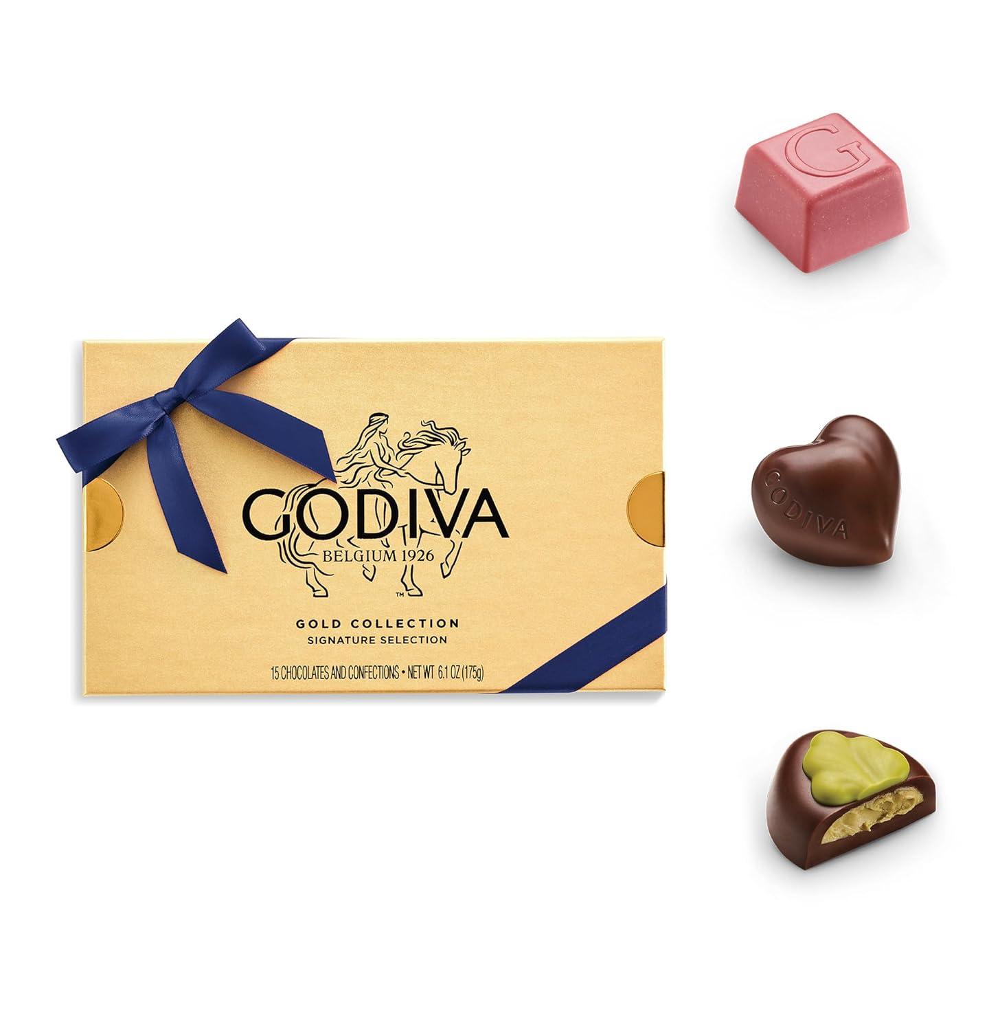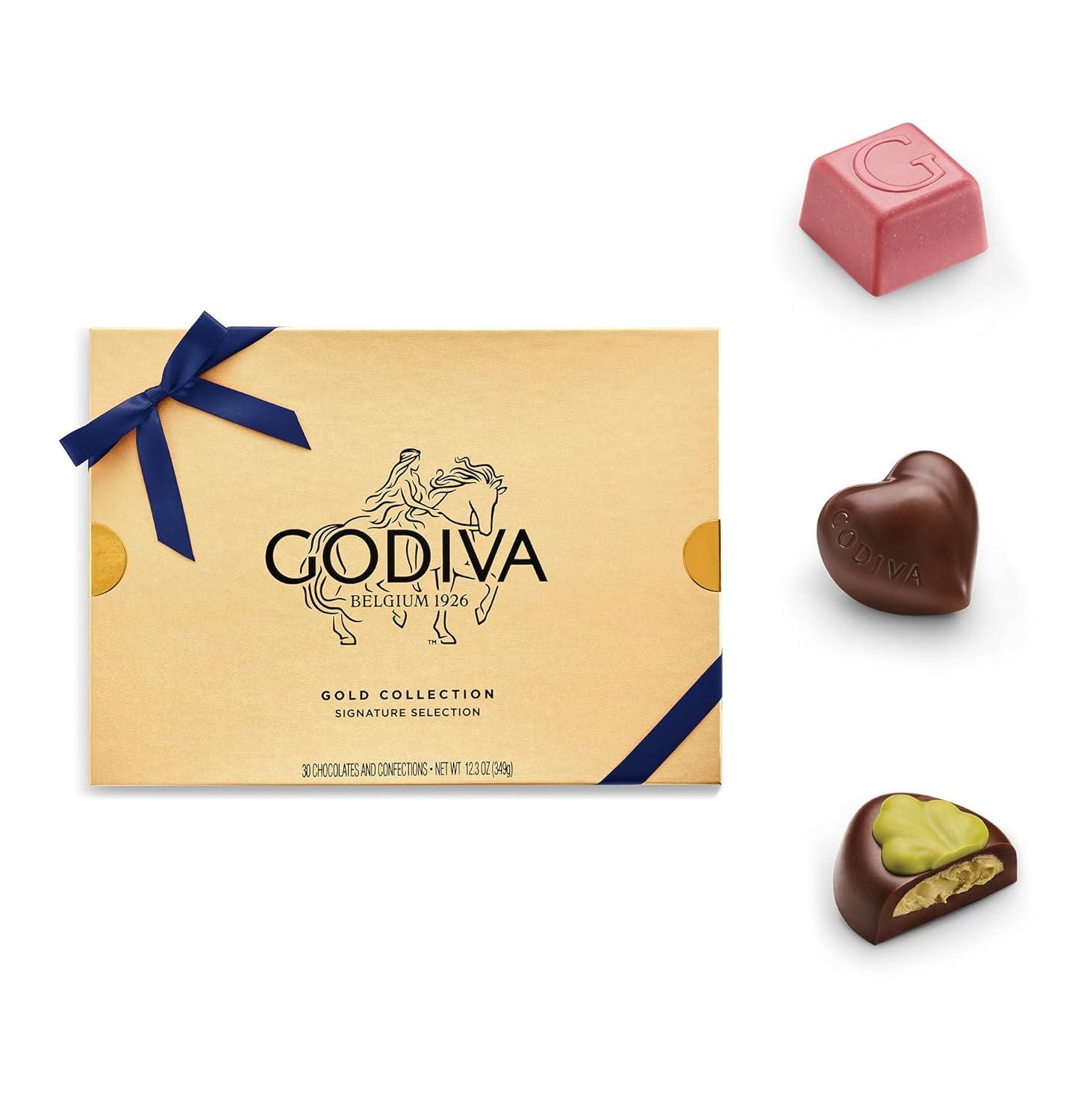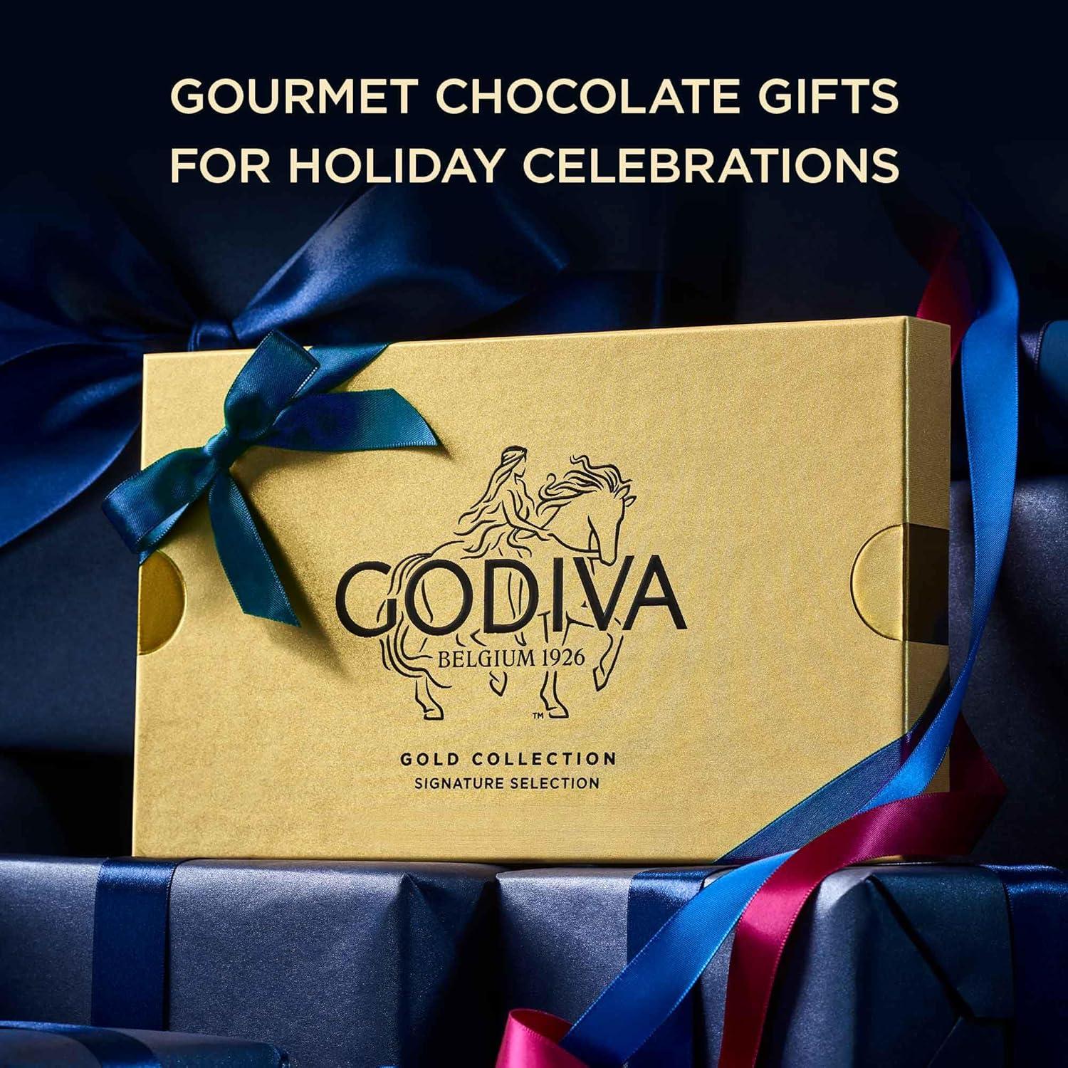 Godiva Navy Bow Gold Assorted Chocolate Gift Box, Dark and Milk Chocolates with Pralinés, Ganaches & Caramels, Gourmet Hanukkah Gift, Non-GMO & Kosher, 30 Pc(Navy Bow – Assorted)